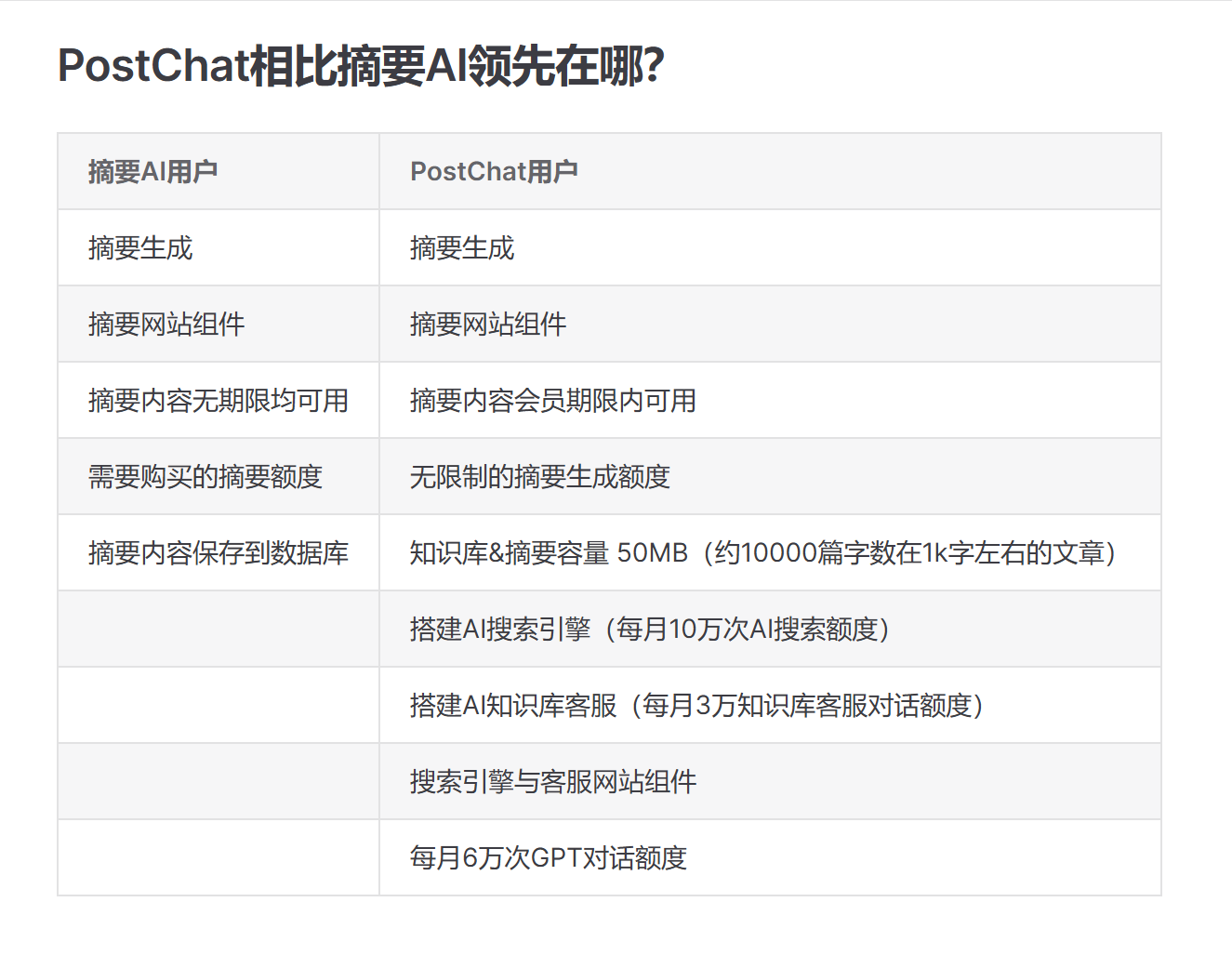 - PostChat: 上面的TianliGPT主要服务于小网站站长和个人用户。PostChat使用了远低于市场AI客服的价格,实现了网站的知识库AI对话、知识库AI搜索、摘要AI、GPT自由对话等功能。