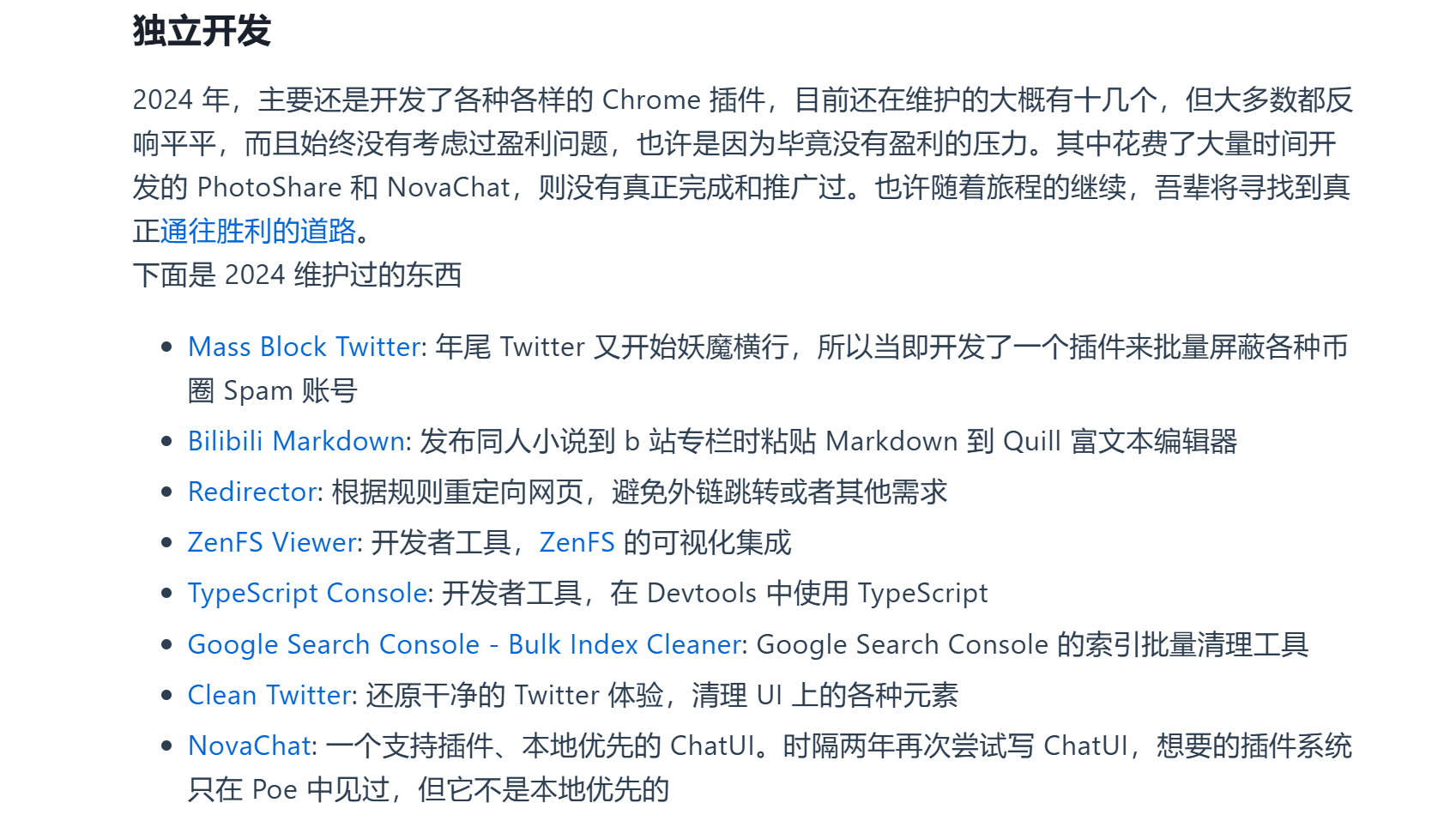 rxliuli博主想回国当独立开发者,2024年时尝试开发了各种Chrome插件,当前在维护的有**十几个!!!**。看2024总结发现他在阳江长租躺平(今年春节才去过,瞬间感觉很神奇)。看图发现他玩了很多地方,真是羡慕。